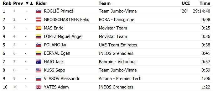 Марк Падун финишировал сегодня в пелотоне и поднялся на 51-е место в общем зачете. Лидирует по-прежнему словенец Примож Роглич из «Jumbo Visma».