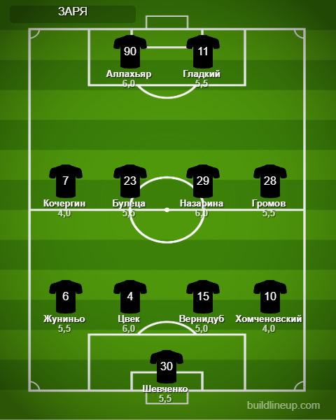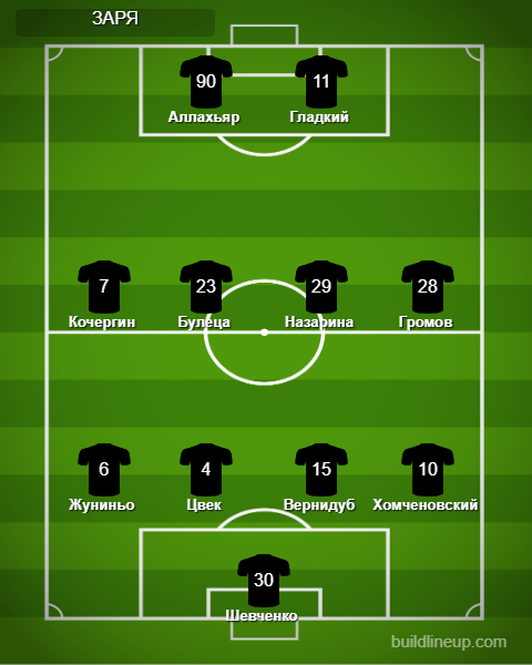 «Заря»: Шевченко (Мацапура, 48), Хомченовский, Вернидуб, Цвек, Жуниньо (Фаворов, 83), Громов, Назарина, Булеца (Кабаев, 64), Кочергин, Гладкий (Кристиан, 83), Аллахьяр (Шахаб, 64).
