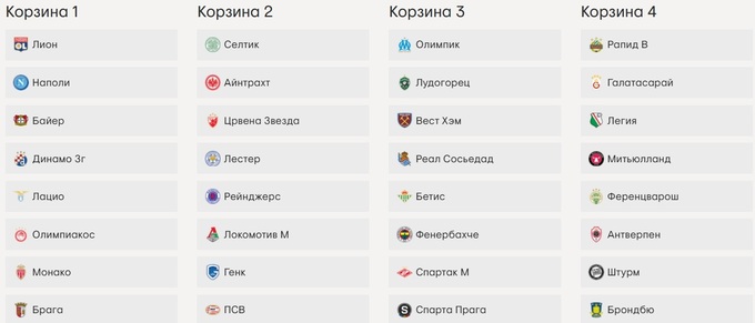 Корзина 1: Лион, Наполи, Байер, Динамо Загреб, Лацио, Олимпиакос, Монако, Брага