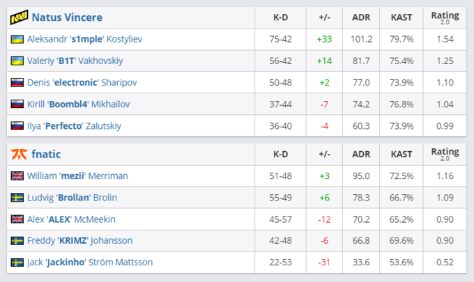 Natus Vincere обыграли Fnatic в группе C на ESL Pro League Season 14 по CS:GO. Команда Александра s1mple Костылева победила со счетом 2:0 (22:19 Overpass, 16:12 Nuke) и заработала три очка.