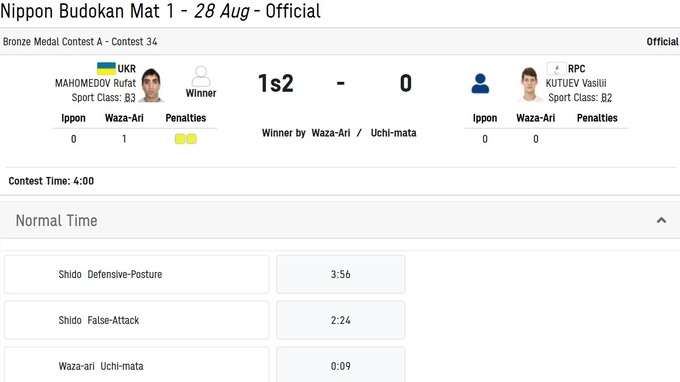 На Паралимпийских играх состоялись соревнования по дзюдо среди мужчин. В категории до 73 кг украинец Руфат Магомедов завоевал бронзовую награду. В схватке за третье место украинец одержал победу над представителем ОКР Василием Кутуевым.