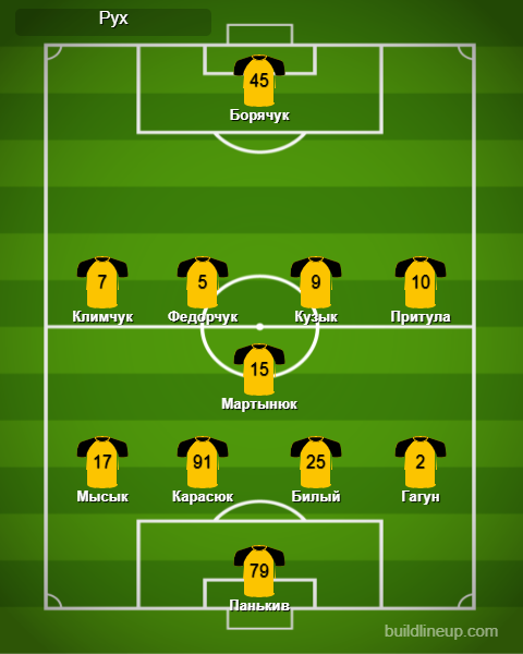 «Рух»: Панькив, Карасюк, Федорчук (Лях, 90+4), Притула (Кухарук, 86), Климчук (Сыч, 90+4), Билый, Гагун, Борячук (Карабин, 86), Кузык (Бойчук, 56), Мысык, Мартынюк.