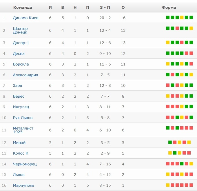 После шести туров первое место занимает киевское «Динамо» – 16 очков из 18. В топ-3 также входят «Шахтер» (13) и «Днепр-1» (13).
