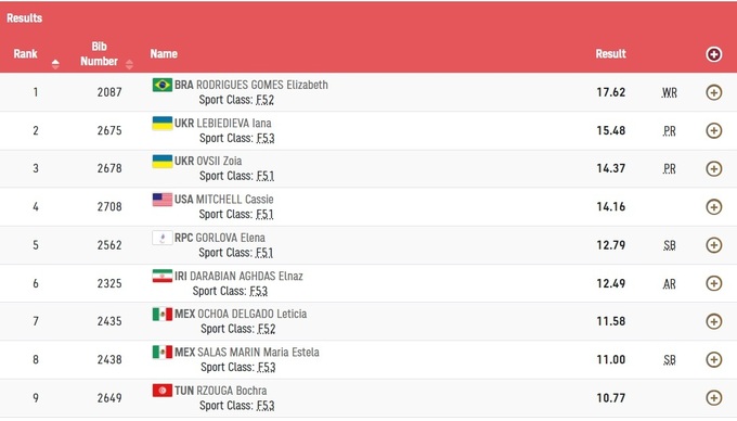 В секторе для метания диска (класс - F51-F53) украинки показали второй и третий результат соответственно. Золотая медаль досталась бразильянке Родригес Гомес, которая завершила соревнования с новым мировым рекордом.