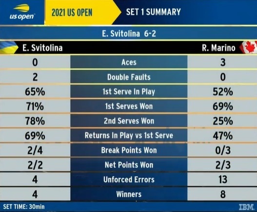 На корте встретились теннисистки, отличающиеся не только по игровому стилю, но и по уровню. Класс Свитолиной несравнимо выше, поэтому для победы в этом матче Марино нужно было самой сыграть на максимум, ожидая при этом попасть на плохой день оппонентки. По итогу не было ни одного, ни другого.