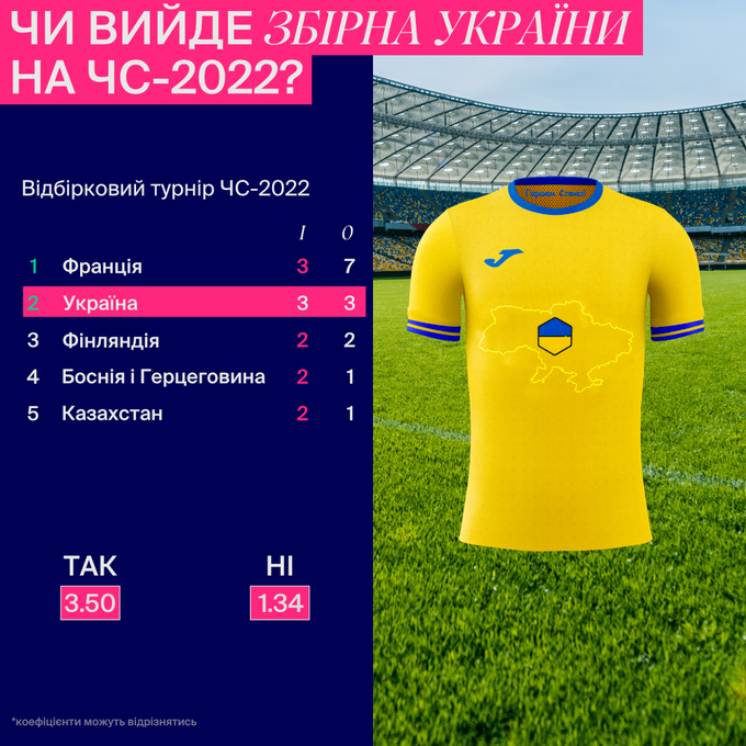 Після трьох турів відбору у України 3 очки. Але якщо гостьова нічия з Францією це успіх, то нічиї з Фінляндією і Казахстаном Україна точно не може записати собі в актив. Обійти Францію і здобути пряму путівку на чемпіонат світу надзвичайно складно. Куди реальніше виглядає боротьба за друге місце з Боснією і Фінляндією. Ну а друге місце дає право зіграти в плей-оф за вихід на мундіаль. При цьому варти нагадати, що тепер в плей-оф потрібно пройти не одного суперника, а двох. Що значно ускладнює шлях. А тому на думку експертів Favbet шанси України на поїздку до Катару лише трохи більше, ніж 25%.
