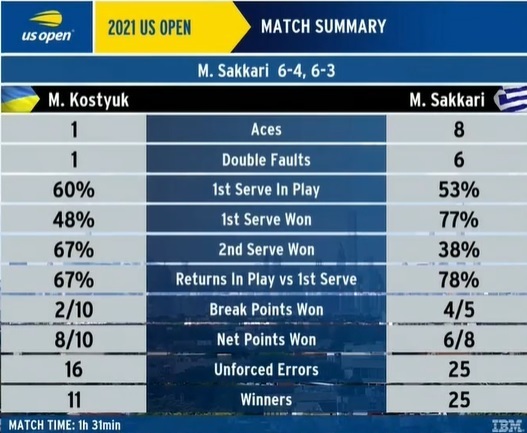 Марта Костюк (Украина) – Мария Саккари (Греция) – 4:6, 3:6