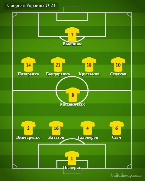 Украина U-21: Нещерет, Вивчаренко, Батагов, Таловеров, Сыч, Михайленко, Назаренко (Брагару, 89), Бондаренко, Крыськив (Желизко, 68), Судаков (Драмбаев, 89), Вьюнник (Супряга, 77).