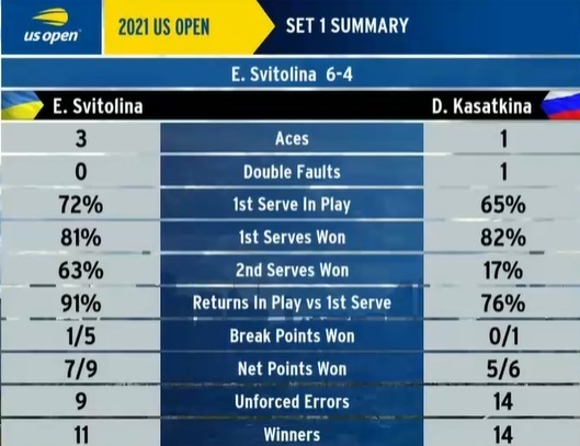 Касаткина долгое время удерживала свои геймы, но после счете 4:4 украинке все же удалось на приеме реализовать свой шанс. Оставалось самой отподавать в таком же стиле, как это было до этого, но в этот момент Элина почему-то решила сыграть чуть спокойнее, за что чуть не была наказана. При счете 30:30 за Касаткину сыграл трос и россиянка заработала первый брейкпоинт в матче. К счастью, Свитолина сразу же решила взять судьбу сета в свои руки, завершив его в атакующем стиле.