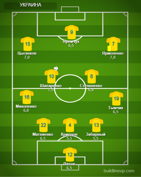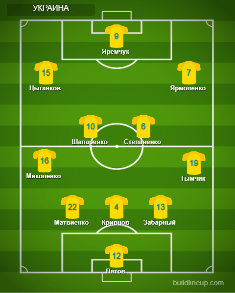 Украина: Пятов, Тымчик, Матвиенко, Кривцов, Забарный, Миколенко, Степаненко, Шапаренко (Сидорчук, 90), Цыганков (Малиновский, 81), Ярмоленко (Зубков, 90+3), Яремчук (Сикан, 81).