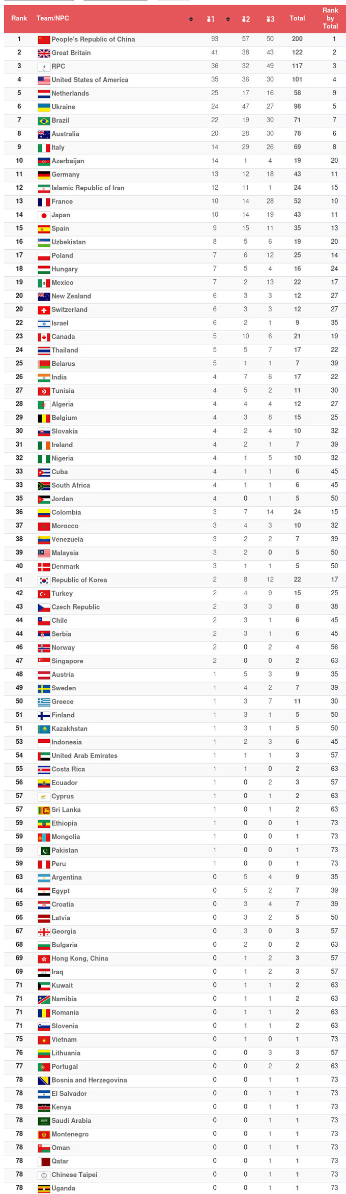Всего Украина имеет 98 медалей (24 золотых, 47 серебряных и 27 бронзовых) и 6-е место общего зачета. Украинцы долгое время занимали 5-е место, но сегодня в топ-5 ворвались Нидерланды.