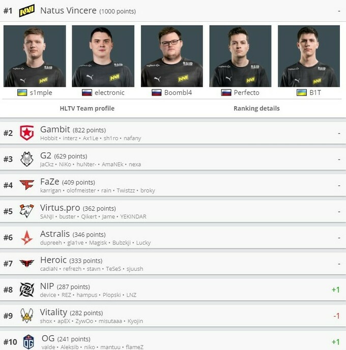 NAVI сохраняют лидерство в мировом рейтинге CS:GO, Gambit – вторые