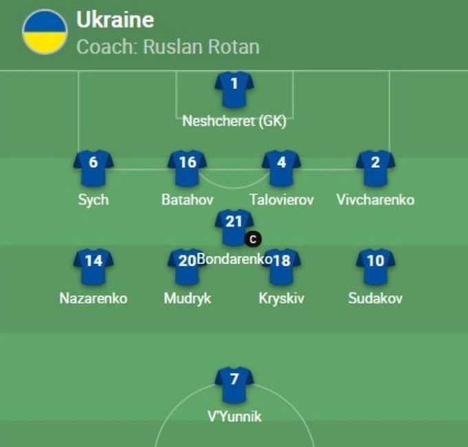Украина U-21: Нещерет, Сыч, Батагов, Толоверов, Вивчаренко, Бондаренко, Назаренко, Мудрик, Крыськив, Судаков, Вьюнник