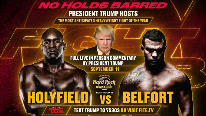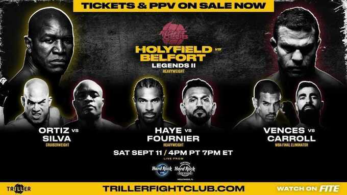 В главном событии встретятся бывший абсолютный чемпион мира в супертяжелом весе Эвандер Холифилд и экс-чемпион UFC Витор Белфорт. Шоу стартует в 02:00, а главный поединок начнется примерно в 05:00 по Киеву.