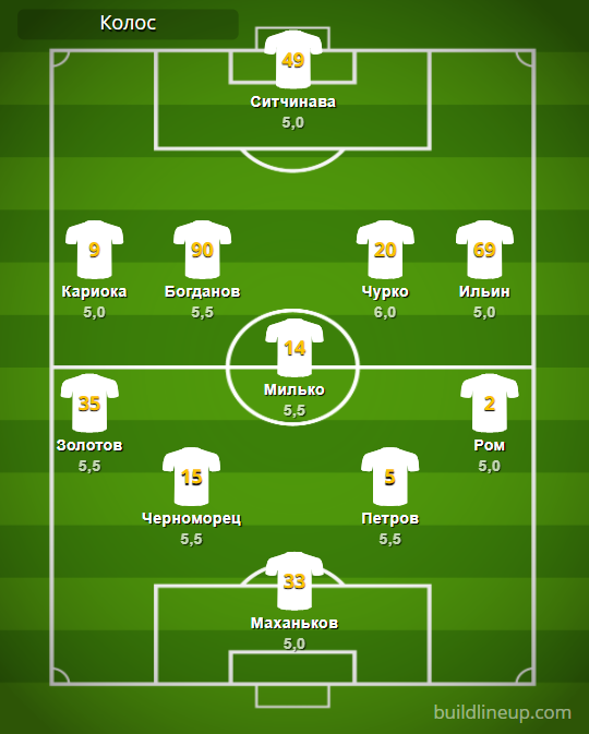 «Колос»: Маханьков – Золотов, Черноморец, Петров, Ром – Милько – Кариока (Ренан, 58), Богданов, Чурко (Костышин, 70), Ильин – Ситчинава (Лысенко, 58).