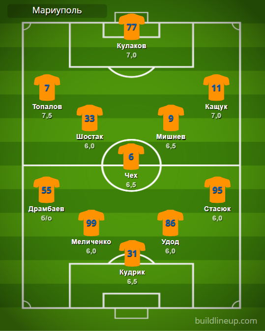 «Мариуполь»: Кудрик – Драмбаев (Холод, 10), Меличенко, Удод, Стасюк – Чех – Топалов, Шостак (Клименко, 46), Мишнев (Петерман, 70), Кащук (Свитюха, 59) – Кулаков (Вьюнник, 59).