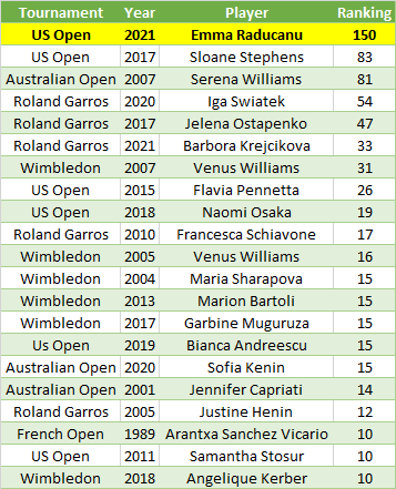 Радукану стала первой теннисисткой с таким низким рейтингом, которая выиграла турнир Большого шлема. Британка побила рекорд американки Слоан Стивенс, которая выиграла US Open, находясь на 83-й строчке мирового рейтинга.