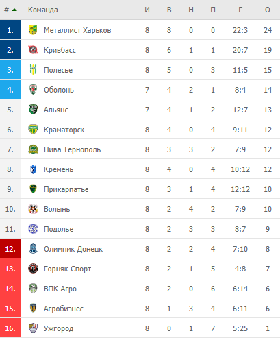 После 8 туров в турнирной таблице лидирует Металлист из Харькова (24 очка из 24 возможных). Второе место занимает криворожский Кривбасс (19). Два клуба поднимутся напрямую в УПЛ, а еще два коллектива будут играть переходные матчи за повышение в классе с 13-й и 14-й командами топ-дивизиона.