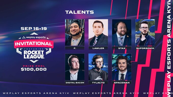 Киберспортивный медиахолдинг WePlay Esports объявил список талантов турнира WePlay Esports Invitational featuring Rocket League. Турнир состоится 16-19 сентября 2021 года. Трансляция будет вестись с киберспортивной арены WePlay Esports Arena Kyiv.