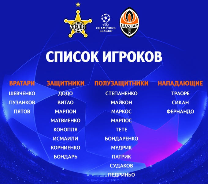 Хавбеки: Степаненко, Майкон, Маркос, Марлос, Тете, Бондаренко, Мудрик, Патрик, Судаков, Педриньо.