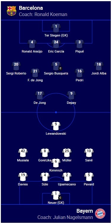 «Барселона»: Тер Штеген, Альба, Пике, Эрик Гарсия, Рональд Араухо, Серхи Роберто, Бускетс, Педри, Ф. Де Йонг, Депай, Л. Де Йонг