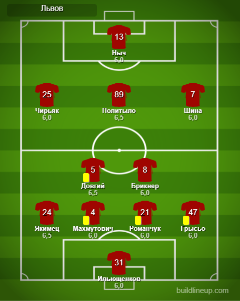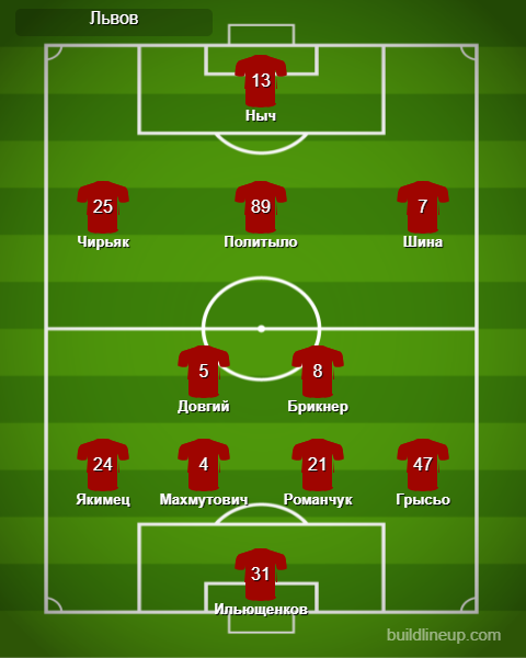 «Львов»: Ильющенков, Ныч (Ременяк, 85), Махмутович, Якимец, Политыло (Альваро, 52), Романчук, Шина (Семенив, 46), Довгий, Грисьо (Бусько, 66), Чирьяк, Брикнер.