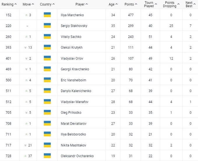 Что касается украинцев, то Илья Марченко поднялся на 3 строчки, Виталий Сачко – на одну. Сергей Стаховский сохранил позицию, Алексей Крутых потерял сразу 13.