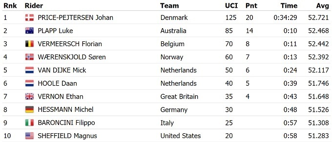 Датский велогонщик Йохан Прайс-Пейтерсен стал чемпионом мира в гонке раздельным стартом среди молодежи (до 23 лет). Это уже пятый чемпионский титул для Дании в этом виде за последние 6 лет. До этого трижды подряд чемпионом становился Миккель Бьерг.
