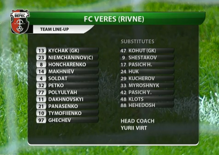 «Верес: Кичак, Немчанович, Гончаренко, Махниев (Мирошник, 75), Солдат, Петько, Полулях, Дахновский (Пасич Г. 70), Панасенко, Тимофиенко (Пасич Ю., 70), Гечев.