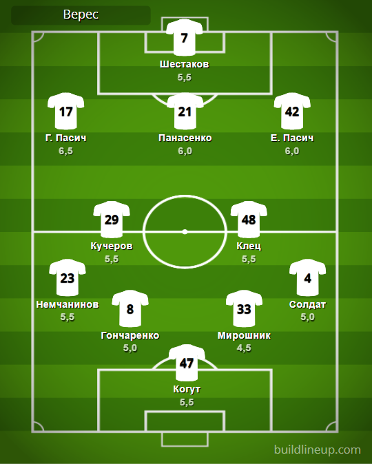 «Верес» (замены): Гегедош – 5,5, Дахновский – б/о, Гечев – б/о, Тимофеенко – б/о, Полюлях – б/о.