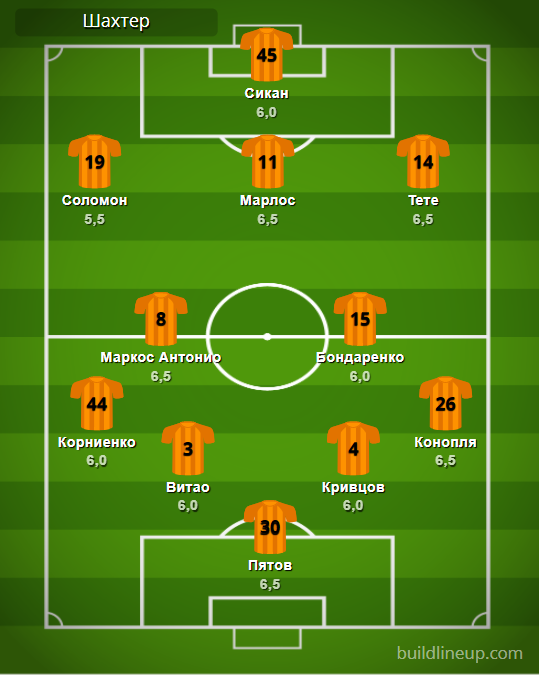 «Шахтер»: Пятов – Корниенко (Исмаили, 70), Витао (Бондарь, 84), Кривцов, Конопля – Маркос Антонио, Бондаренко (Майкон, 63) – Соломон (Мудрик, 70), Марлос, Тете – Сикан (Траоре, 63).