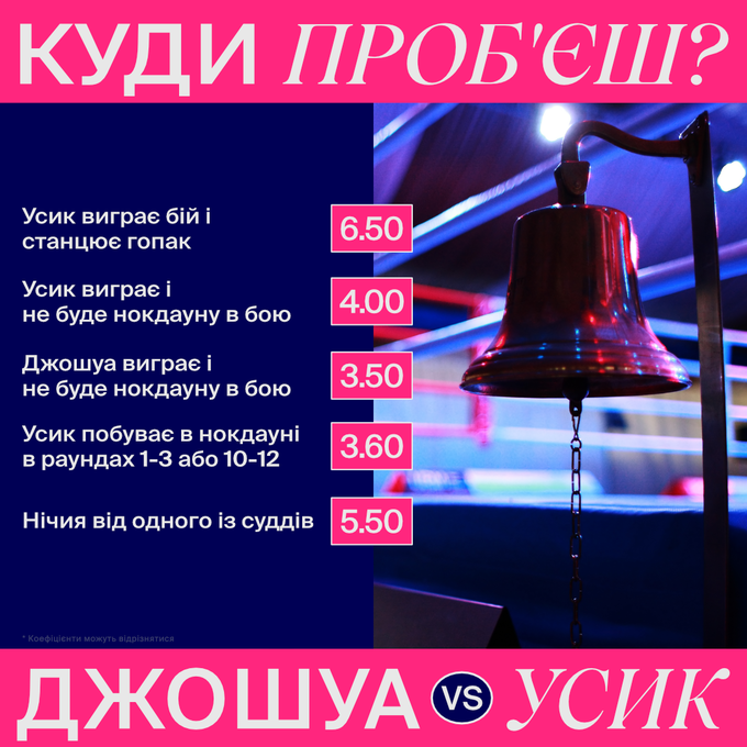 Несмотря на неоднозначные высказывания Усика в минувшие годы, после которых часть болельщиков перестали его поддерживать, большинство украинцев всё же и дальше продолжают болеть за Александра. И шансы против Джошуа у него имеются. У британца есть слабые места, и их мы видели как в легендарном поединке с Владимиром Кличко, так и два года назад, когда Энтони проиграл нокаутом Руису. Таким нокаутирующим ударом как Руис украинец не обладает и его шанс в том, чтобы победить Джошуа по очкам благодаря скорости и боксерскому интеллекту. В конце концов, в отличие от Джошуа, Усик ни разу не проигрывал на профи-ринге. Как знать, может ему таки дастся сохранить «ноль» в графе «поражения»