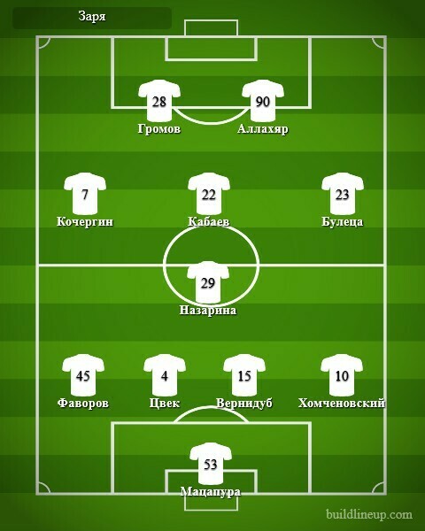 «Заря»: Мацапура, Фаворов, Вернидуб (Имереков, 36), Цвек, Хомченовский, Назарина, Громов (Лунев, 92), Кочергин, Булеца (Шахаб, 68), Аллахяр (Снурницын, 92), Кабаев (Кристиан, 92).