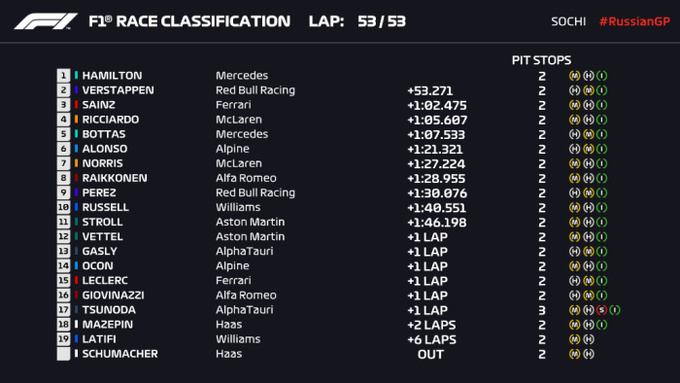 Топ-10: Хэмилтон, Ферстаппен, Сайнс, Риккардо, Боттас, Алонсо, Норрис, Райкконен, Перес, Расселл