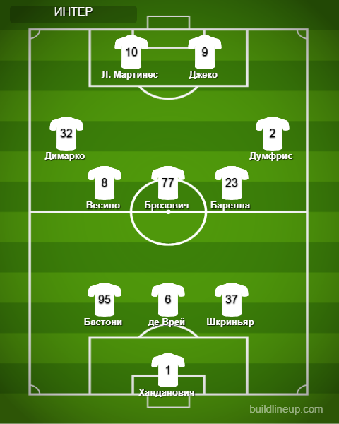 «Интер»: Ханданович - Шкриньяр, де Врей, Бастони - Думфрис, Барелла, Брозович (Чалханоглу, 55), Весино (Гальярдини, 82), Димарко (Перишич, 82) - Джеко (Корреа, 55), Л. Мартинес (А. Санчес, 72).