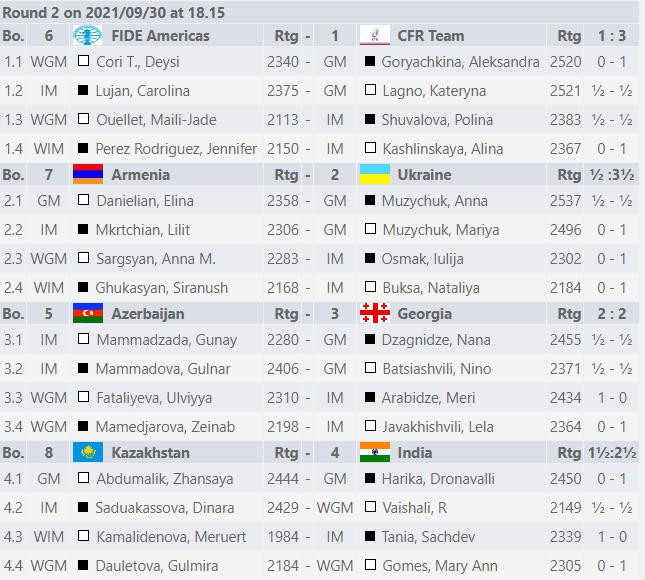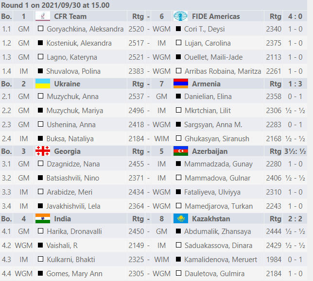 Шахматистки из России в 1/4 финала дважды легко обыграли сборную стран Америки (4:0, 3:1). Во втором полуфинале сыграют команды Грузии и Индии.