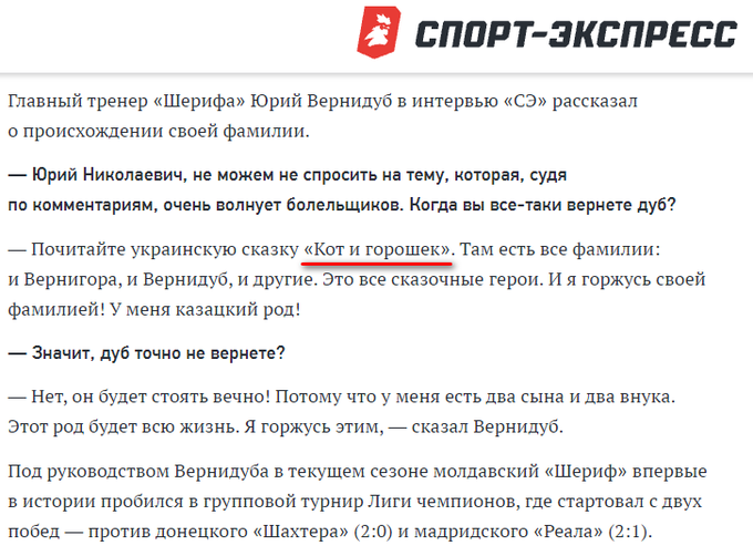 После ярких успехов тираспольского «Шерифа» в Лиге чемпионов журналисты российского издания «Спорт-Экспресс» задали шуточный вопрос украинскому тренеру команды Юрию Вернидубу по поводу его фамилии: