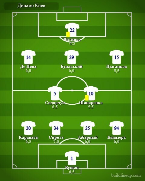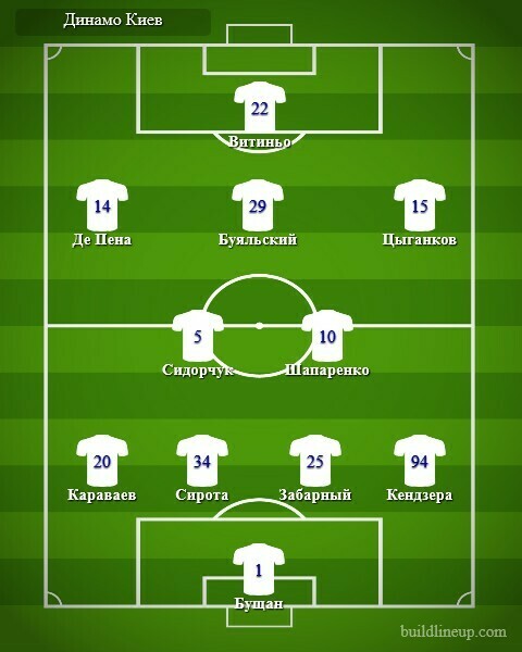 «Динамо»: Бущан, Караваев, Забарный, Сирота, Кендзера (Тымчик, 86), Сидорчук, Шапаренко, Де Пена, Цыганков, Витиньо (Шкурин, 86), Буяльский (Гармаш, 86).