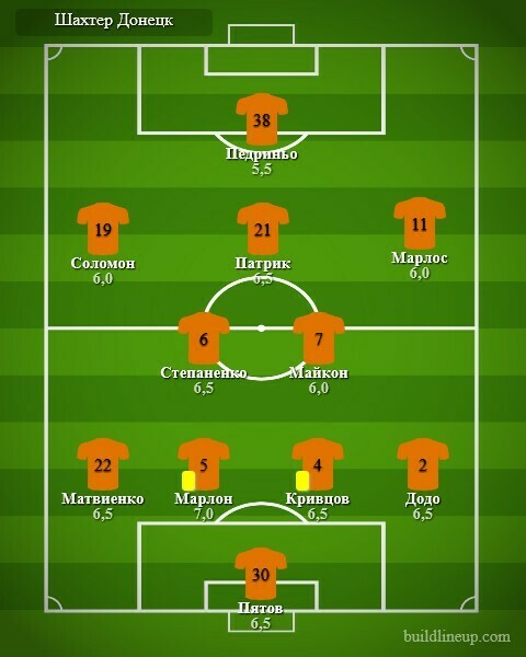 «Шахтер»: Пятов, Додо, Кривцов, Марлон, Матвиенко, Степаненко (М.Антонио, 65), Майкон, Марлос (Тете, 65), А.Патрик, Соломон (Сикан, 65), Педриньо.