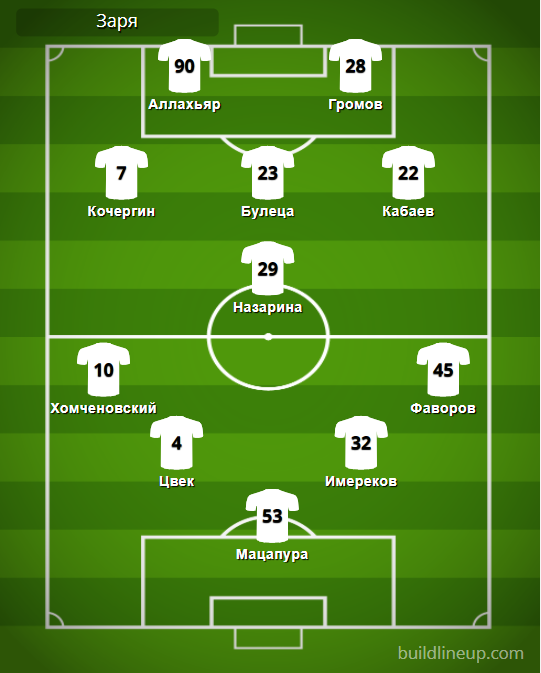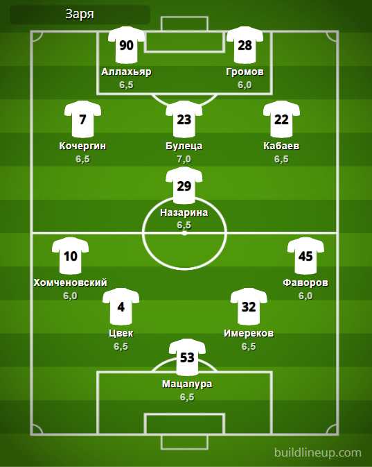 «Заря»: Мацапура – Хомченовский, Цвек, Имереков, Фаворов (Фримпонг, 90+3) – Назарина – Кочергин, Булеца (Лунев, 75), Кабаев (Гладкий, 75) – Аллахьяр (Снурницын, 90+3), Громов (Шахаб, 75).