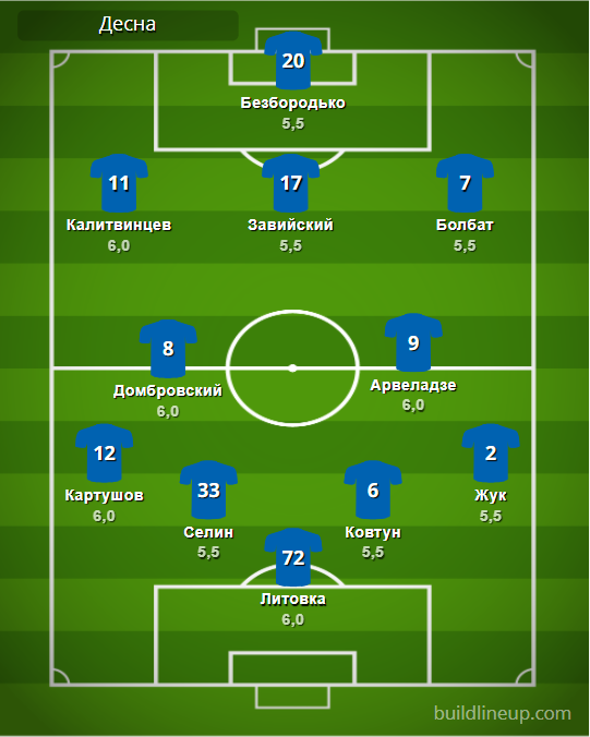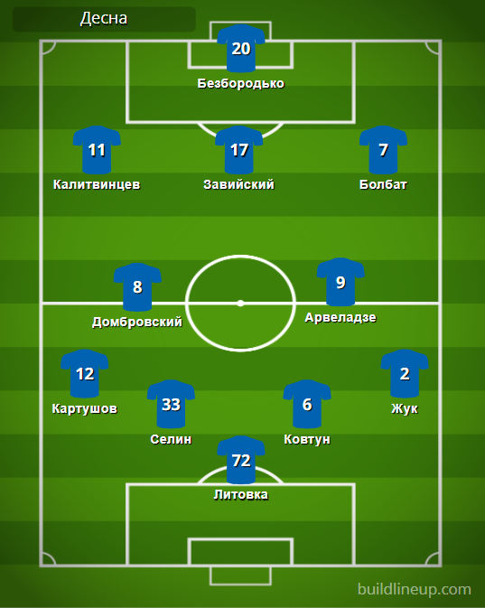 «Десна»: Литовка – Картушов (Дегтярев, 86), Селин, Ковтун (Сафронов, 46), Жук (Масалов, 76) – Домбровский, Арвеладзе (Юрченко, 76) – Калитвинцев, Завийский, Болбат – Безбородько (Будковский, 46).