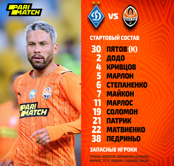 Шахтер: Пятов, Додо, Кривцов, Марлон, Матвиенко, Степаненко, Майкон, Алан Патрик, Соломон, Марлос, Педриньо