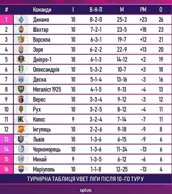 После 10 туров «Динамо» опережает «Шахтер» на три очка (26 против 23). Киевская и донецкая команды в очном поединке сыграли вничью в Киеве (0:0). Третью позицию занимает «Ворскла» (21). Замыкает турнирную таблицу УПЛ «Мариуполь» (4).