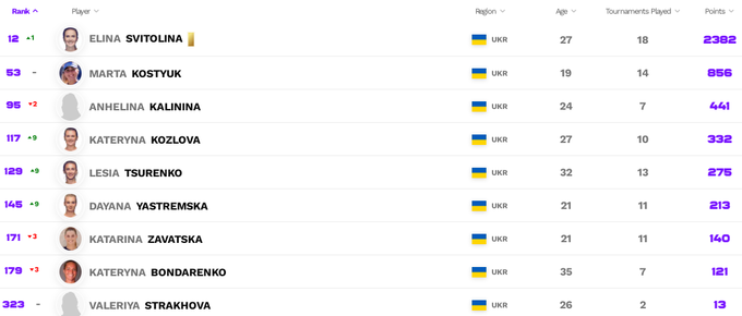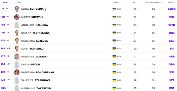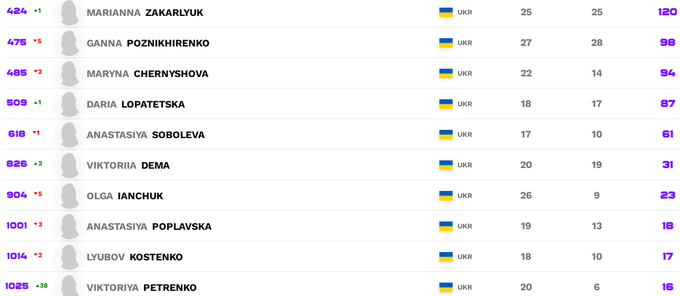 Что касается украинок, то кроме Свитолиной позиции теряют Костюк, Калинина, Ястремская и Завацкая. У Козловой, Цуренко и Снигур ситуация стала лучше. Дарья, к примеру, обновила личный рекорд в рейтинге – 192 место.