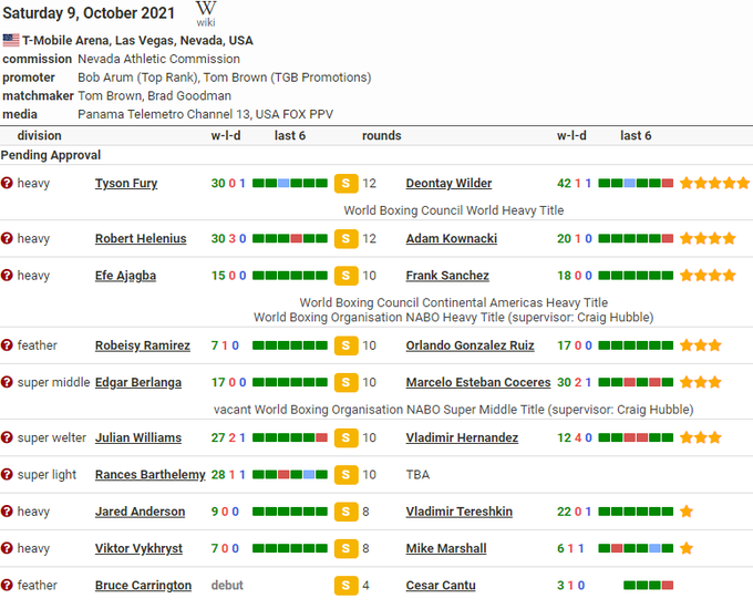 - Тайсон Фьюри (30–0–1) – Деонтей Уайлдер (42–1–1)