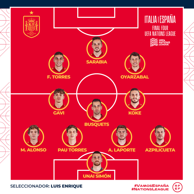 Испания: Симон – Аспиликуэта, Ляпорт, Пау Торрес, Алонсо – Коке, Бускетс, Гави – Сарабия, Торрес, Оярсабаль.