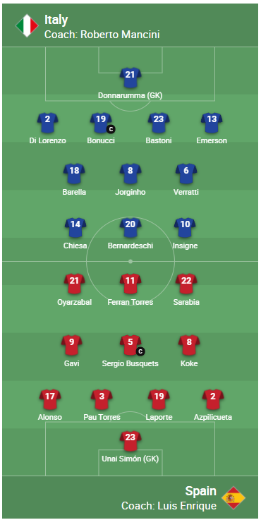 Италия: Доннарумма – Ди Лоренцо, Бонуччи, Бастони, Эмерсон – Барелла, Жоржиньо, Верратти – Кьеза, Инсинье, Бернардески.