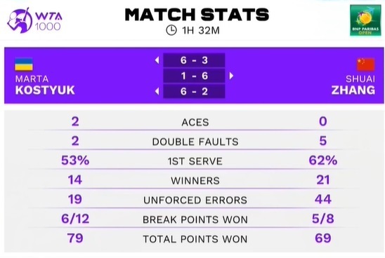 Марта Костюк (Украина) – Чжан Шуай (Китай) – 6:3, 1:6, 6:2