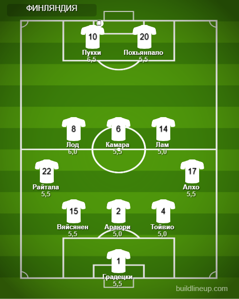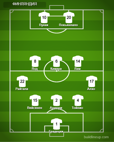Финляндия: Градецки - Алхо (Хямяляйнен, 62), Тойвио, Араюри, Вяйсянен, Райтала (Нисканен, 77) - Лам (Ниссиля, 62), Камара, Лод - Похьянпало (Риски, 77), Пукки.