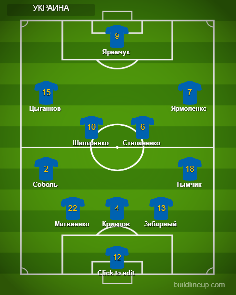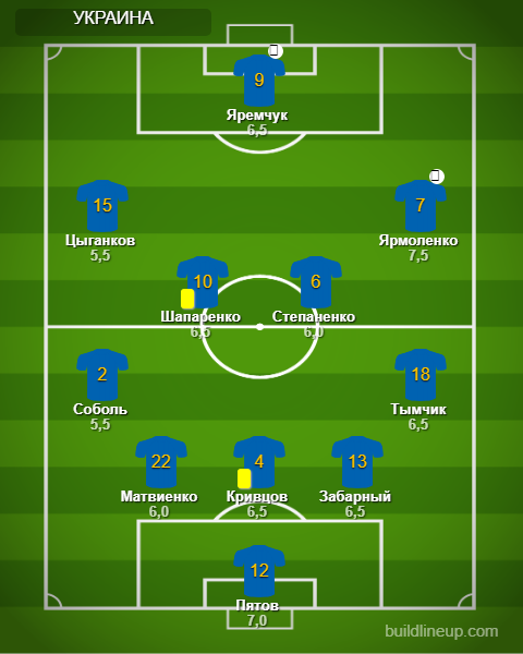 Украина: Пятов - Тымчик, Забарный, Кривцов, Матвиенко, Соболь (Корниенко, 46) - Степаненко (Сидорчук, 77), Шапаренко - Ярмоленко (Булеца, 86), Цыганков (Зубков, 77) - Яремчук (Довбик, 86).